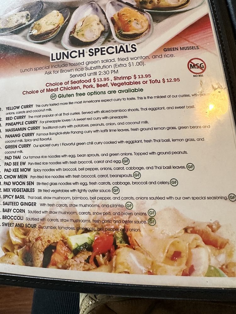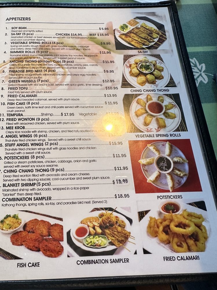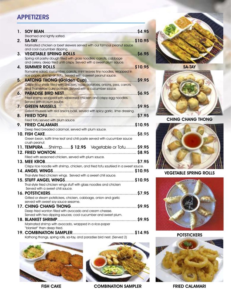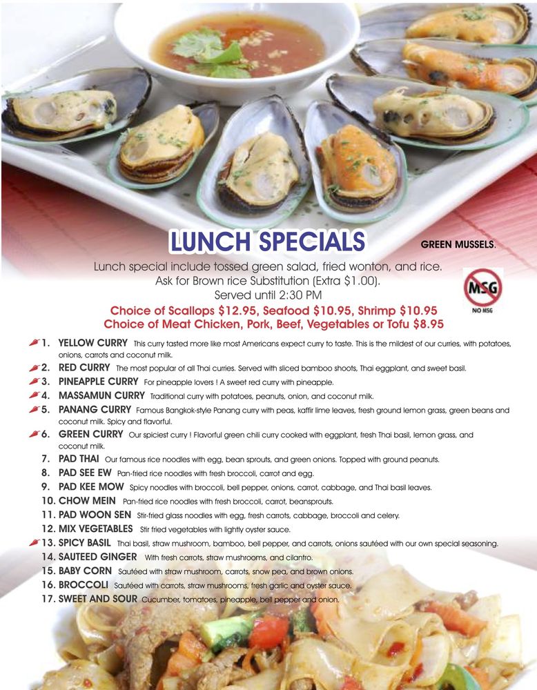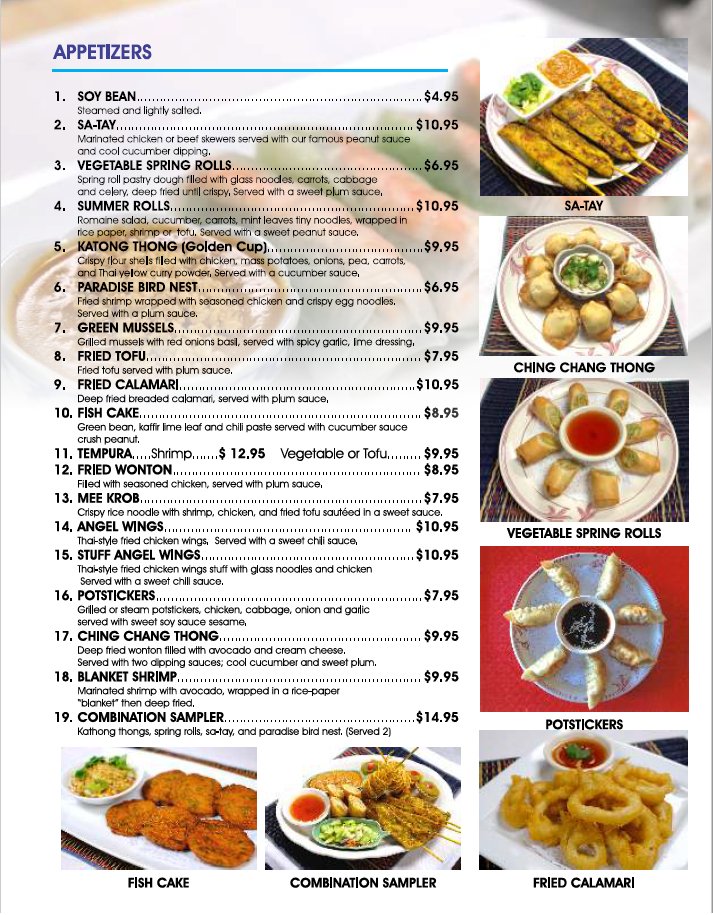 The menu is a vibrant tapestry of traditional Thai offerings, featuring mouthwatering lunch specials like the Yellow Curry and Panang Curry, both brimming with aromatic herbs and spices. Appetizers such as Paradise Bird Nest and Coconut Shrimp set the stage for a flavorful experience.